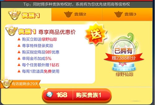 玩家充值购买天天酷跑贵族特权VIP1后可以获得系统赠送的绿野仙踪精灵一只,还有2388积分赠送,小编感觉是非常超值的,毕竟168钻石不仅可以获得积分还有特权享受。