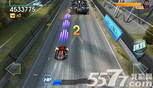 重点来了,第二关如何不掉血呢,小编在五条赛道中选择了中间的那条,之后你就可以不用再换赛道了,一根手指足矣,车子只要解决掉中间这条赛道上的油桶和战车就够了,其他的赛道上的战车是打不到你的,很多玩家经常会掉血都是因为当BOSS打到后面的时候会放导弹,为了躲避导弹你不得不换赛道,导致被其他赛道上的油桶或战车打到,小编教大家怎么躲避导弹,当导弹的锁定圈(2个红圈)重叠在一起的时候,点击跳跃键,轻轻松松就躲过去了,是不是很简单,但是小编要提醒大家的是,按跳跃的时机需要把握准,那就是在两个锁定圈重叠的那个时候,不论是跳早了还是跳晚了都是会被打中的哦。