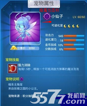 2、不知道宠物等级的玩家可以查看宠物的星级,有些宠物是不能进化到月亮级的,所以只能进化到3星、4星的低级暗属性宠物都可以当作进化材料来使用。