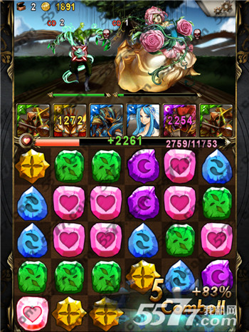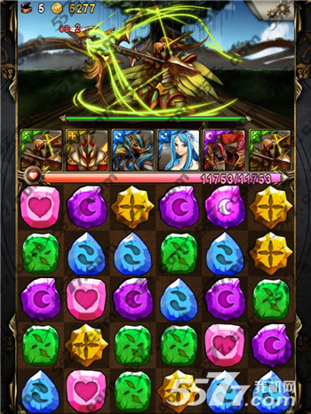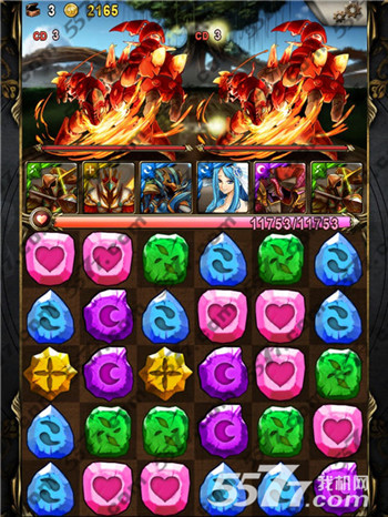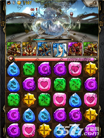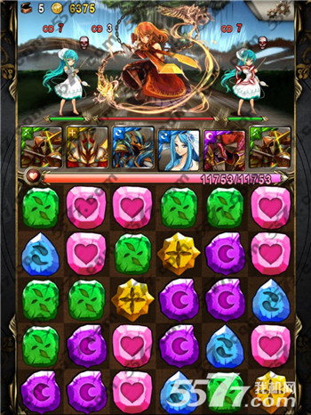 这里是第9回合,毫无悬念,你必须先干掉左右两个木妹子,因为你不会撑得住他的一下攻击。这个我需要点人品,双木游不好的地方就是,全体单体攻击2.5倍,所以我一定不能出现5珠相连,否则我一波会杀不掉一个。若一波攻击,秒不到她,她就会补满血=。= 这个设定~~ 没什麽。起码我觉得比起COMBO盾好多了~