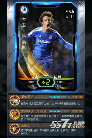 因为众所周知,这款游戏有个缺陷(姑且称之为缺陷) 玩家不能自主控制射门球员,这就导致前锋、中场、后卫,谁都可能是进球的那个,那么中场进攻强大就可以弥补前场人员过少的缺陷阵形自然更加均衡,而楼主比较喜欢大卫路易斯,就因为全体加攻击的逆天技能 (楼主认为好多单一加中场或者前场 )附图一张