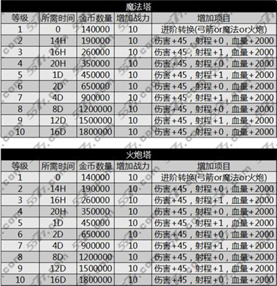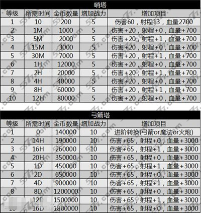 备注:只有高阶防御塔(哨塔10级进阶后),才具备3个防御塔技能效果。技能可提升防御塔的属性,及每个防御塔特殊的效果。