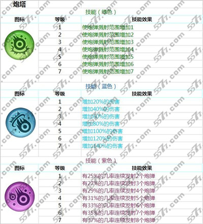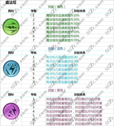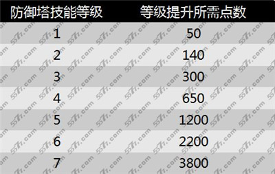 备注:每个技能分7级。根据放置在防御塔上的英雄,来启动对应防御塔技能的等级效果,初始防御塔技能为0级。(至少需要启动1级的技能,防御塔在攻击时,才能产生技能效果。)