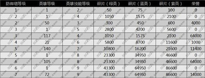 驻塔技能等级对应的英雄属性(参考,其中,碎片即指英雄技能提升至该等级所需碎片)