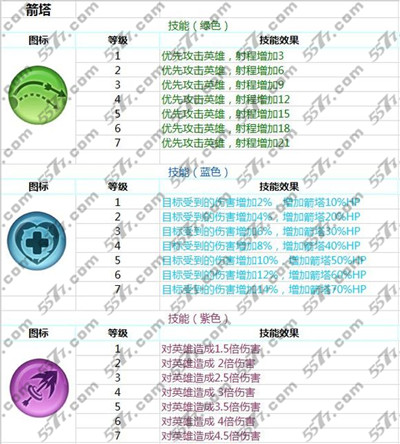 备注:根据英雄的绿色、蓝色、紫色品质,来提升防御塔的绿蓝紫技能效果。