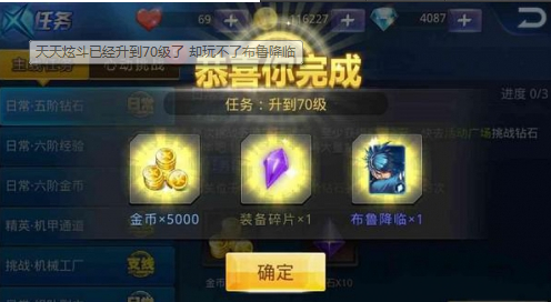1、玩家将角色升级到70级后,系统就会奖励5000金币和1块装备碎片,同时还会获得布鲁降临道具。