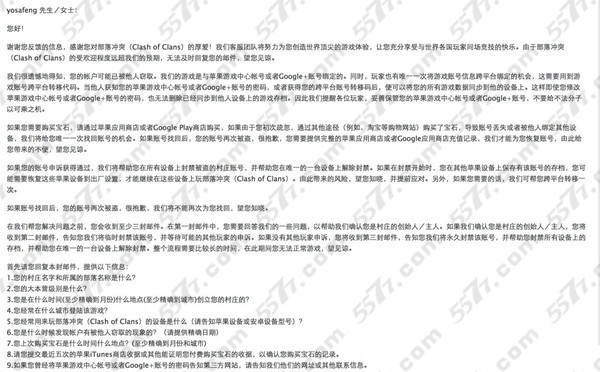提示:其它什么你的村庄或者账号信息什么都不用写。写信开头注明“Chinese feedback”。你发完这个邮件以后,SC会立即回复你说已经受理巴拉巴拉,然后保持每天一封邮件的频率发送邮件,直到第二天你起床惊喜的发现SC再次回复你邮件!运气好的只发一封就回复你,运气不好的可能要半个月。