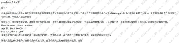在你发送了申诉信息后,信息没什么问题的话,SC会发送一封邮件给你。主要内容:说明可以帮助你这次申诉,已经发现你是黑卡充值用户,但是因为你是被害者,所以会帮助你,但是如果你再黑卡充值,就会永久封禁你的帐户。