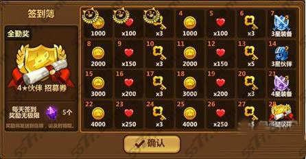 玩家签到一个月还可以获得全勤奖,获得1-4星级小伙伴招募劵一张,玩家使用招募劵可以随机获得一只小伙伴。每天首次登录游戏即可在弹出页面中自动签到,同时获得对应奖励,爱心、钥匙、金币、钻石、装备、伙伴,应有尽有!