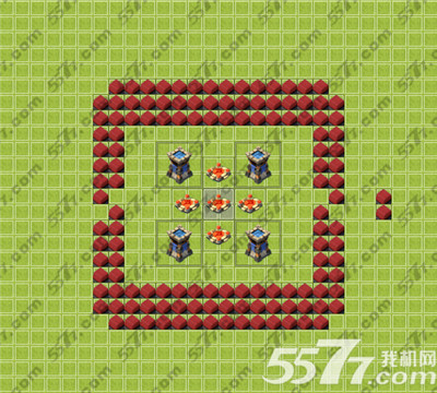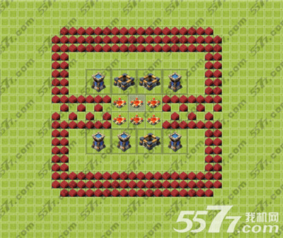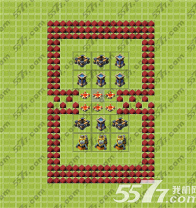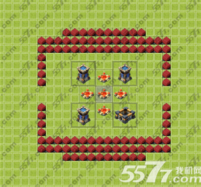13级主城的方形阵,金库水库就照顾不到了,只能保证怪物攻城时能有比较好的表现,可以在下线前把部分箭塔替换成满的金库水库,多了两个墙,自己随便摆吧