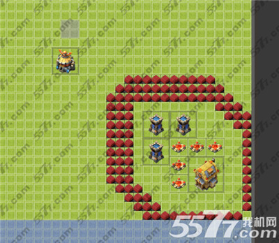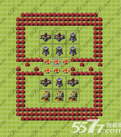 二,放12个建筑的,这个阵型最外侧的建筑离底座比较远,底座等级要求比较高,不然英雄覆盖不到建筑,如果有飞行敌方来打的话比较吃亏。