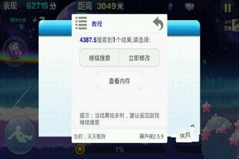 2.打开葫芦侠修改器,数值搜索搜4387.5这个是浮空的代码,会异常会封号,不要乱修改