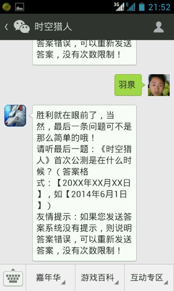 2012.11.07我答过了,有的玩家表示不行,亲们可以看一下答题是否按照规范格式填写来的?之后亲们回答成功以后,就会出现,下面一段话: