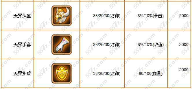 看完了武器介绍,下面再来看下其他部位的装备,天界头盔可以增加防御力和暴击属性,天界手套增加30点防御值和10%攻击速度,天界护盾增加30防御值和100血量。