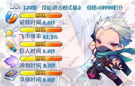 天天酷跑人物闪电骑士满级属性介绍:磁铁时间+8.75秒;飞币爆率+87.5%;巨人时间+8.75秒;冲刺时间+3.2秒;浮梯时间+8.75秒。