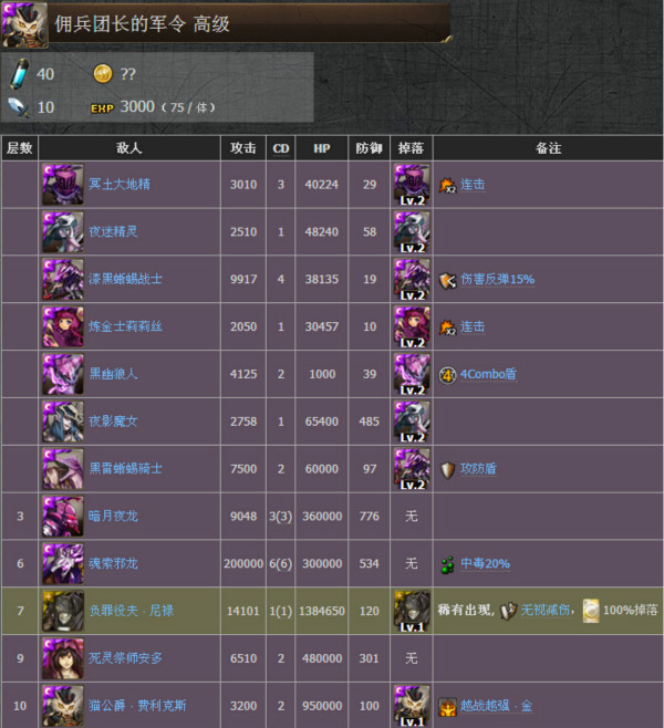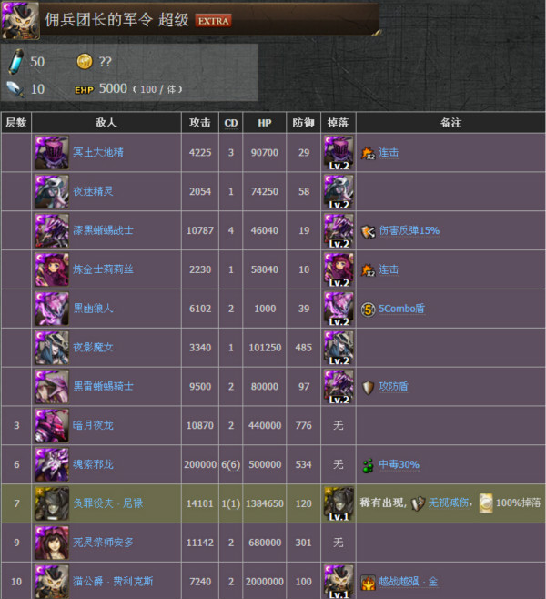 备注:敌人在CD0发动攻击时将连续进行两次攻击。倘若单次攻击大于当前血量50%,则使不倒意志类的队长技能无法发动