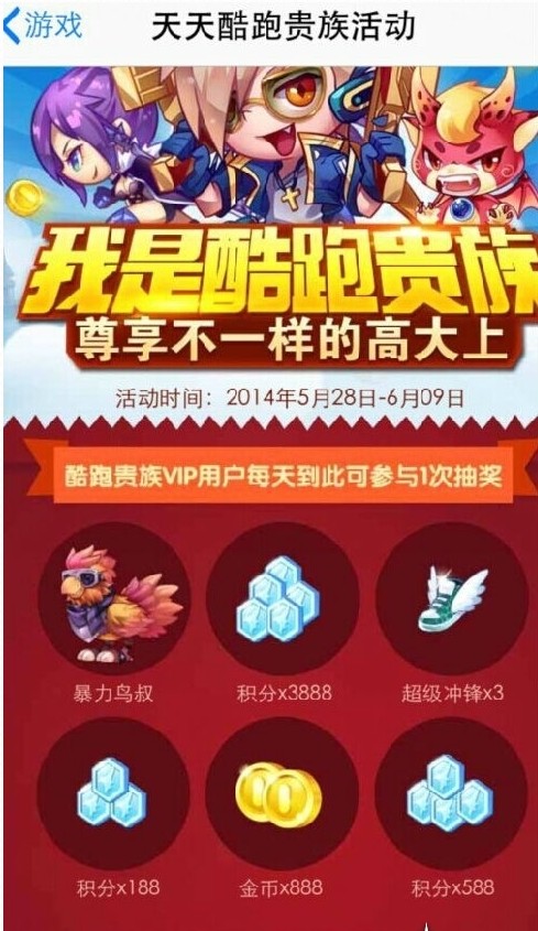 天天酷跑的贵族玩家们你们知道手机QQ推出了贵族玩家免费抽奖的活动吗?不知道的赶快看过来,暴力鸟叔,3888积分等你抽,千万不要错过了