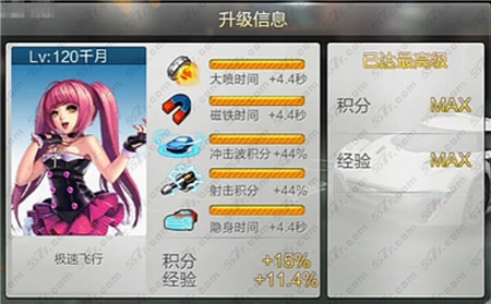 千月满级为120级,角色的特效技能是极速飞行,在当前版本中暗影橘子是120级的车手,所以属性和暗影橘子有点类似,大喷时间、磁铁时间、隐身时间多4.5秒,冲击波积分增加45%,射击积分增加45%,积分增加15%,经验增加11.4%。暗影橘子的特效技能并不是极速飞行,暗影橘子这个车手的特殊技能是提升加油站燃油量5%,所以可以增加赛车的燃油量。