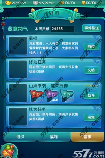 不过建设洞府也不能一步登天,每日玩家可领取的“洞府差事”有上限--每日可完成3次建设任务,进行一次“募捐”交纳银子或元宝;白天的整点(9:00-12:00)有可能触发山妖入侵的事件。玩家需要抓住每一次机会提升洞府建设进度。