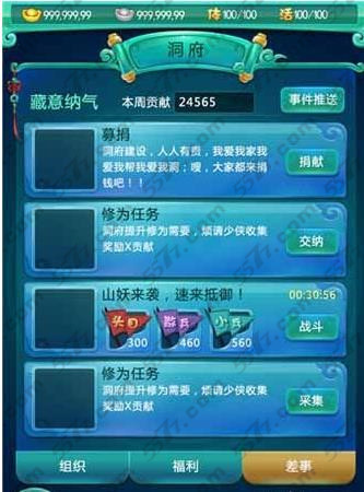 玩家可以消耗1000元宝创建“洞府”(该元宝将成为洞府元宝),并设定个性化的名称、徽章、口号。1级洞府初始可容纳玩家5人,提升“房舍”可以提升容纳的人数上限,最多可容纳50名玩家。