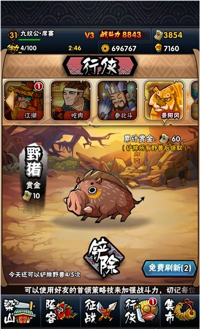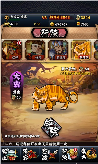 景阳冈玩法是在每天提供5次铲除野兽的机会,野兽会分等级,铲除不同的野兽可以获得不同的银票奖励。玩家可以每次都铲除更高级别的老虎,这样就可以获得丰富的银票奖励