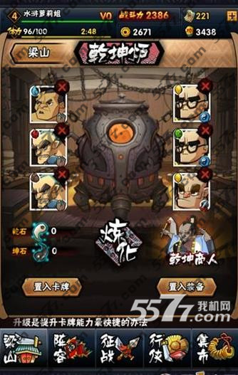 说了这么多乾石和坤石的作用,我想玩家们一定想知道乾石和坤石怎么获得吧。玩家在可以点击游戏主界面的【梁山】,然后点击乾坤炉,将低级卡牌和低级装备放入到乾坤炉中熔炼,就可以获得一定数量的乾石和坤石,其实乾坤炉也就是一个拆解、分解卡牌和装备的地方,可以为玩家节省不少的包裹空间。