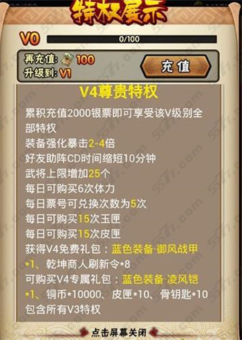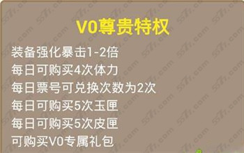 VIP0特权:强化装备增加1-2倍的暴击,每日可以购买4次体力,同时还可以购买5次玉匣子和次皮匣。
