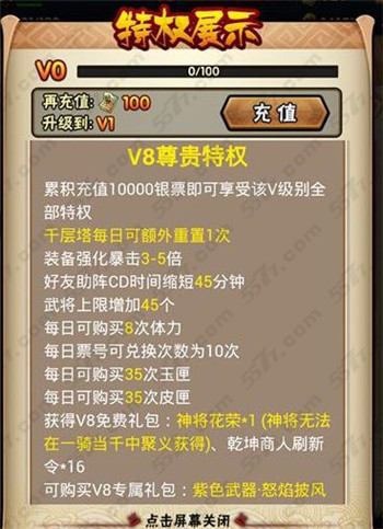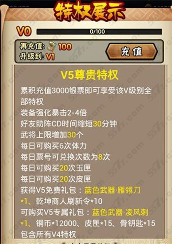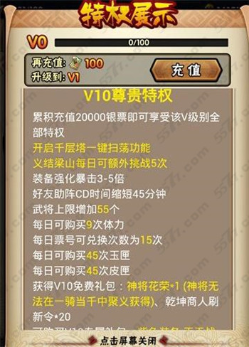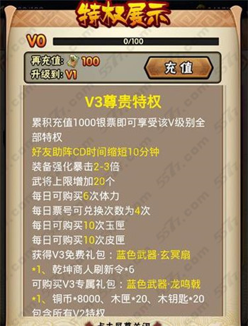 V3特权需要累积充值20000银票,玩家在战斗的时候好友助战CD减少45分钟,暴击增加3-4倍,武将上限增加55个。同时还开启千城塔扫荡功能。