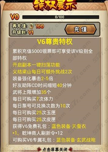 充值100银票可以获得VIP1特权,VIP2贵族特权需要玩家累积充值500银票,相当于人民币50元,武将上限增加15个,可以获得V2礼包,蓝色装备和乾坤商人刷新令4张。