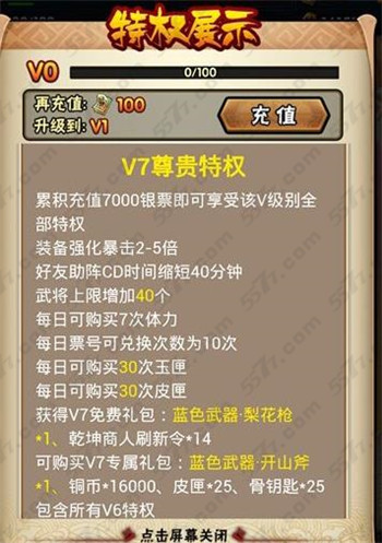 V3特权需要累积充值7000银票,玩家在战斗的时候好友助战CD减少40分钟,暴击增加2-3倍,武将上限增加40个。获得蓝色武器梨花枪和开山斧。