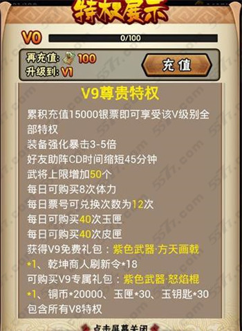 V3特权需要累积充值15000银票,玩家在战斗的时候好友助战CD减少45分钟,暴击增加2-3倍,武将上限增加50个。可以获得紫色武器。