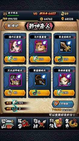 乾坤石商人处可以使用乾坤石和银票兑换武将星宿和蓝紫装的碎片。系统会刷定时刷新所能兑换的物品,我们也可以花费令牌或者银票进行刷新。第一次刷新消耗10银票,随后每次刷新增加10银票,100银票封顶。或者每次消耗一个令牌,系统默认优先消耗令牌。