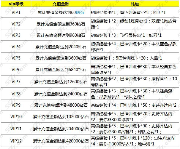 绝杀2014VIP共有12个等级,游戏中有不少的6元党,充值6元就可以获得VIP1特权,可以获得初级经验卡道具一张,黄色训练背心一件,回历一份。vip2需要充值360钻石,相当于人民币36元,可以获得绿创1练背心和初级经验卡,还有狗皮膏药*1赠送,运动员在训练的时候难免会受伤,贴上药膏效果非常的不错。