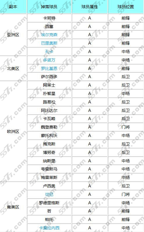获得a卡的途径还是很多的,使用友情点数和钻石抽卡都有几率获得a卡,一球成名副本中也能获得a卡,三天更新一次,基本上都是a卡哦,还有几率见到 s卡。最后一种也是最土的一种方法,就是去刷各大洲的联赛了,小编尝试了一下,还是有几率出的,下面,小编就将自己统计的图片共享出来,这样玩家们就知道 在什么洲可以刷什么球员了。