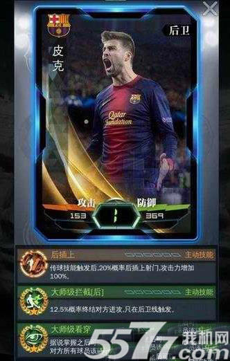 1、皮克,大师级拦截神技,有12.5%的概率拦截对方的进攻,还有个技能是大师级看穿,可以清楚的了解到对手的一些出球技能,技能后插上有20%的概率插上射门,攻击力可以增加100%,相当的不错,但是转会费需要1041万,有点小贵。