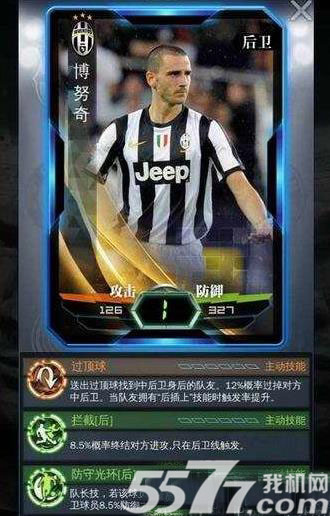 2、博努奇464万,对于这个球员不介绍,攻击力为126、防御力为327,技能是过顶球和拦截,过顶球有12.5%概率终结对方的后卫进攻。