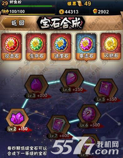 点击“阵容——宝石——宝石合成”,选择需要合成的宝石,将材料自动放置入合成炉,进行合成。每4个低级宝石,可合成1个下一级高级宝石。每次合成,需要消耗掉一定铜币。游戏中的银票可以通过普通副本、英雄副本、参北斗等手段活动。