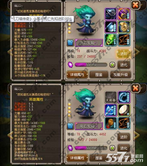 然后我们再来看看燃烧远征的大热门死亡先知,在死亡先知升级紫色+2之后生命值仅仅提升了520点;法强增长了453点;护甲加了13点法抗增加了55点;法爆减少了12点。 这些都是在紫色+2有2个5星装备的情况下才只有这么一点点提升,紫色+1的时候装备才3星,因此可以看到死亡先知即使+2也不是什么合算的事情,装备不齐全刷装备要时间和资源,而且关键的紫装需要80级才可以装备,因此80级之前升级+2是很亏的。