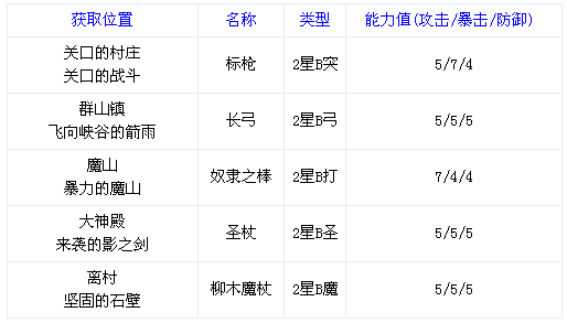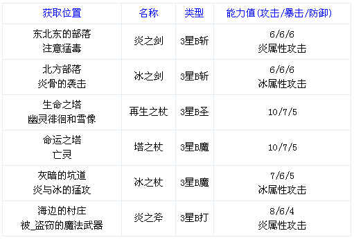 武器共分为斩,突,打,弓,魔,圣6个种类,武器进化能且只能进化为同类别的武器。