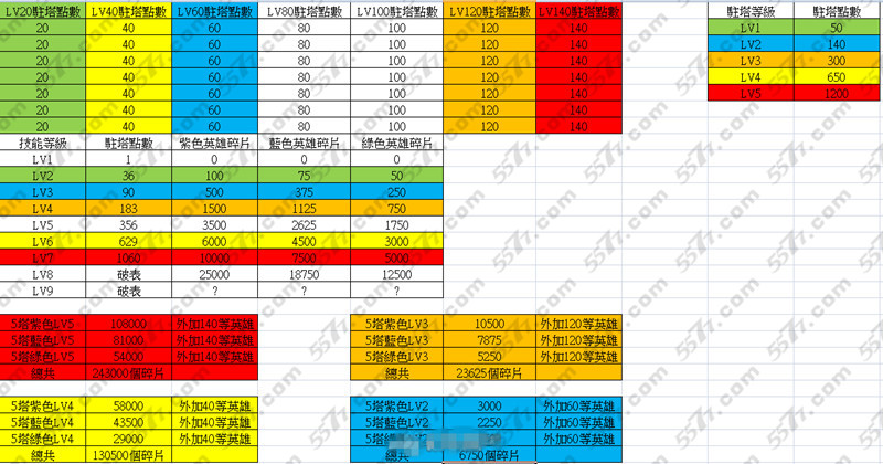 如图请照颜色 ,看所需要的英雄等级&碎片数量,绿色lv1 蓝色lv2 ,依此类推,更正图表错误忘记累加数字更可怕了。
