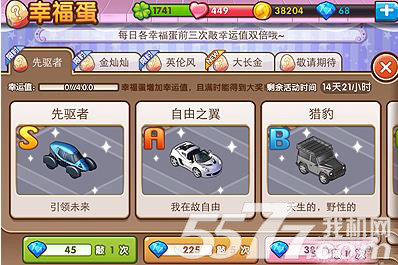 此次S车抽奖活动时间还是比较长的,所以玩家不要着急,尽可能的完成每日的任务,最大化的生产来获得大量的钻石和金币。扭蛋系统以前是90钻石一次,此次更新后,砸蛋的价格变为45钻石,玩家再也不怕手抖一下子花费90钻石了,目前砸蛋只需要45钻石。最低价让你在抽奖系统中获得S级车。