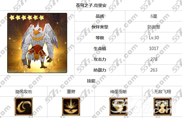苍穹之子克里安,6星防御型,满级生命1017,攻击力278,防御力263。这属性确实是蛮高的,要是装备配好一点那就更完美了,不亏第一神T之名。