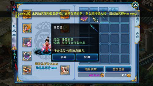 第一、穿云箭在包裹的任务格子里面,先按游戏界面左边的任务提示走到指定地点,然后使用穿云箭就行了。