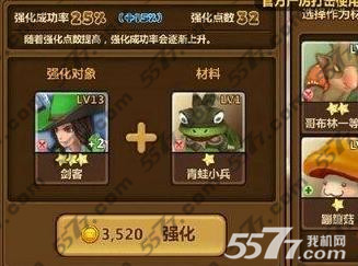 一般小伙伴需要合成就需要满级并且强化+5的2个同星级小伙伴才可以合成,因此除了升满级,还要注意强化,一般强化从3星开始,3星强化3星一般是100%,2星就是50%,1星就是25%,强化失败一次就增加5%的成功概率,所以3星卡强化到+5不是很困难,不过同其它游戏一样,强化的时候最好用一下垫子,强化+1、+2尽量用1星卡来垫,到+3的时候再使用2星卡来强化。为了保证成功率+4+5最好用3星来强化,这样消耗并不是很大,也很省钱。