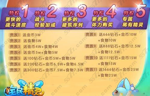 全民精灵贵族特权共有11个等级,每个等级都有不同的特权,全民精灵贵族特权福利非常的不错,可以增加战斗速度、经验加成,同时还能摆放较多的建筑物,购买体力的次数也会增加,更加吸引人的是还有专属稀有精灵赠送。