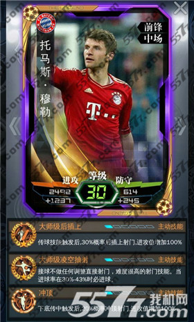 中场因为经典卡难求小法是个不二人选,因为现在可以点亮8个人,所以边路的里贝里(天梯50送)算是也活了当然吉格斯也是牛的一比啊,再加一个天梯买的加图索或者马克莱莱来稳固一下防线,中场也就差不多了。另外要说的是想触发小法的直塞,和配合传中,楼主买了穆勒!!本人觉得穆勒是张神卡两个接球技能但是就是基础攻击太低了,就喂了点脑残片给他。。。
