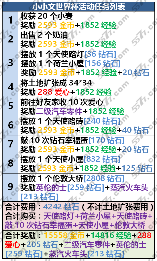 前八次的任务都比较简单,像什么收集小麦啊,生产东西啊之类的东西。需要摆放的建筑,也都只有几百钻就能搞定。不过第九个任务需要一个伦敦大桥,这一个就价值近三千钻了。可见也是非常的坑爹了。下面是这次活动合计奖励,大家可以好好研究一下,然后决定自己到底做不做这个任务吧,不过这次送的建筑也的确挺好看的。