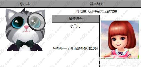 第五组,小贝儿和A级宠物李小本的组合,当李小本和小贝儿组合的时候可以使用一个他们的组合技能,使得小贝儿可以变大并且带有无敌的效果,在小贝儿每获得一个金币的时候都可以额外的增加10分。