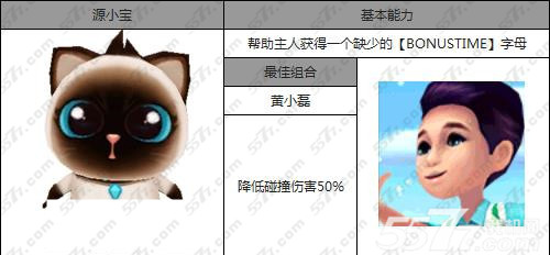 第七组,S级宠物源小宝和黄小磊的组合,当源小宝和黄小磊组合的时候,可以获得一个组合技能使黄小磊获得一个他缺少的{BONUSTIME}字母,并且可以使他减少受到的碰撞伤害50%。