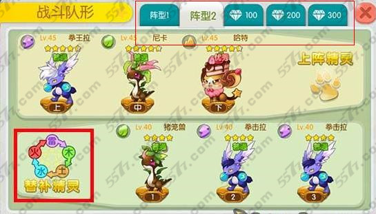 2、布阵系统中有2个免费阵型可以使用,达到一定等级后,就可以将6个位置全部解锁,这6个位置中,可以在前排放3只比较强力的精灵,然后再后面放上3只替补精灵。